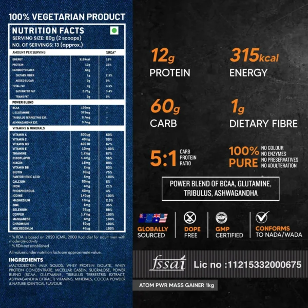ATOM PWR Mass Gainer with BCAA, L-Glutamine, Tribulus, Ashwagandha