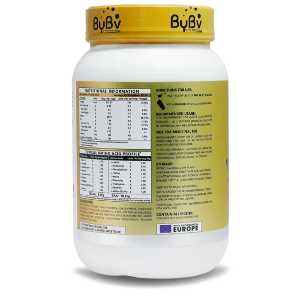 Each serving (33G) of ByBv Max Whey Isolate-Belgian Chocolate gives you 22G of Protein with zero added sugar, low carbs & 5.06G of BCAA.