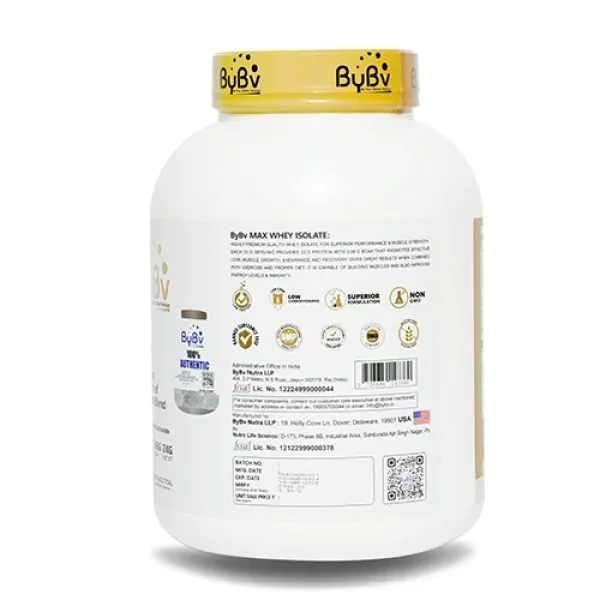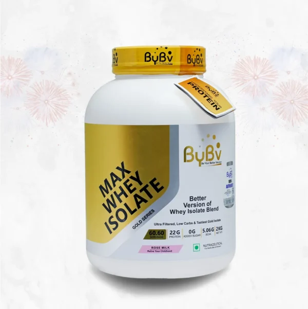 Each serving (33G) of ByBv Max Whey Isolate-Rose Milk gives you 22G of Protein with zero added sugar, low carbs & 5.06G of BCAA.